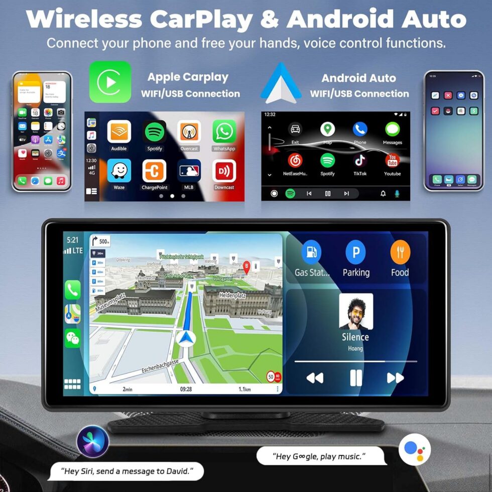 • Безжичен Apple CarPlay & Android Auto: Поврзете го телефонот без кабли. Сите ваши апликации (Google Maps, Spotify, Waze, WhatsApp) се веднаш достапни на големиот екран.
